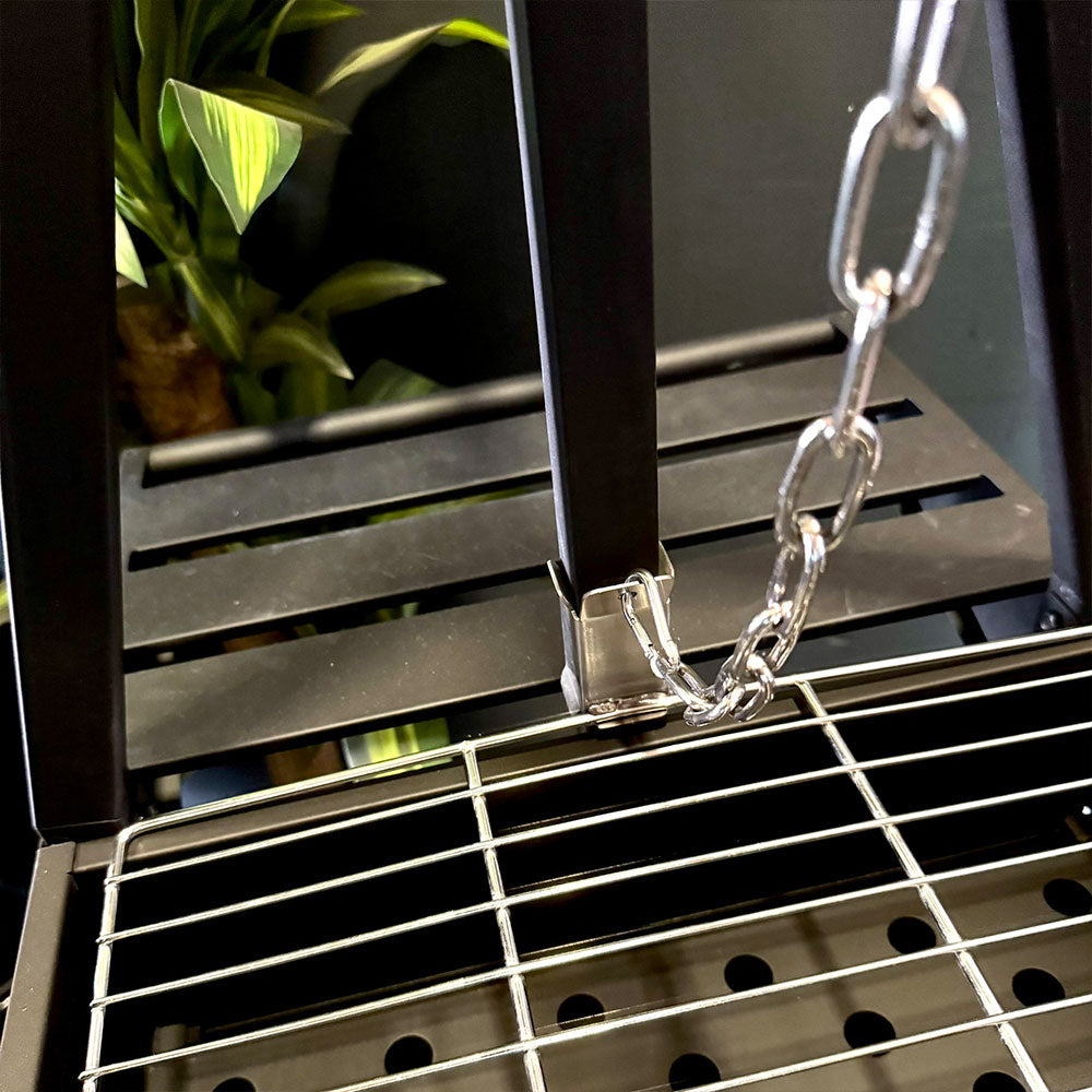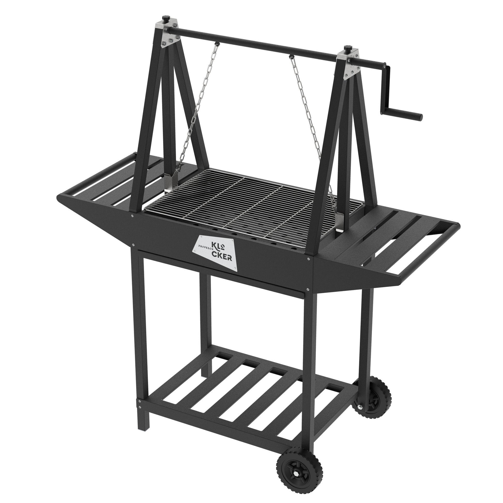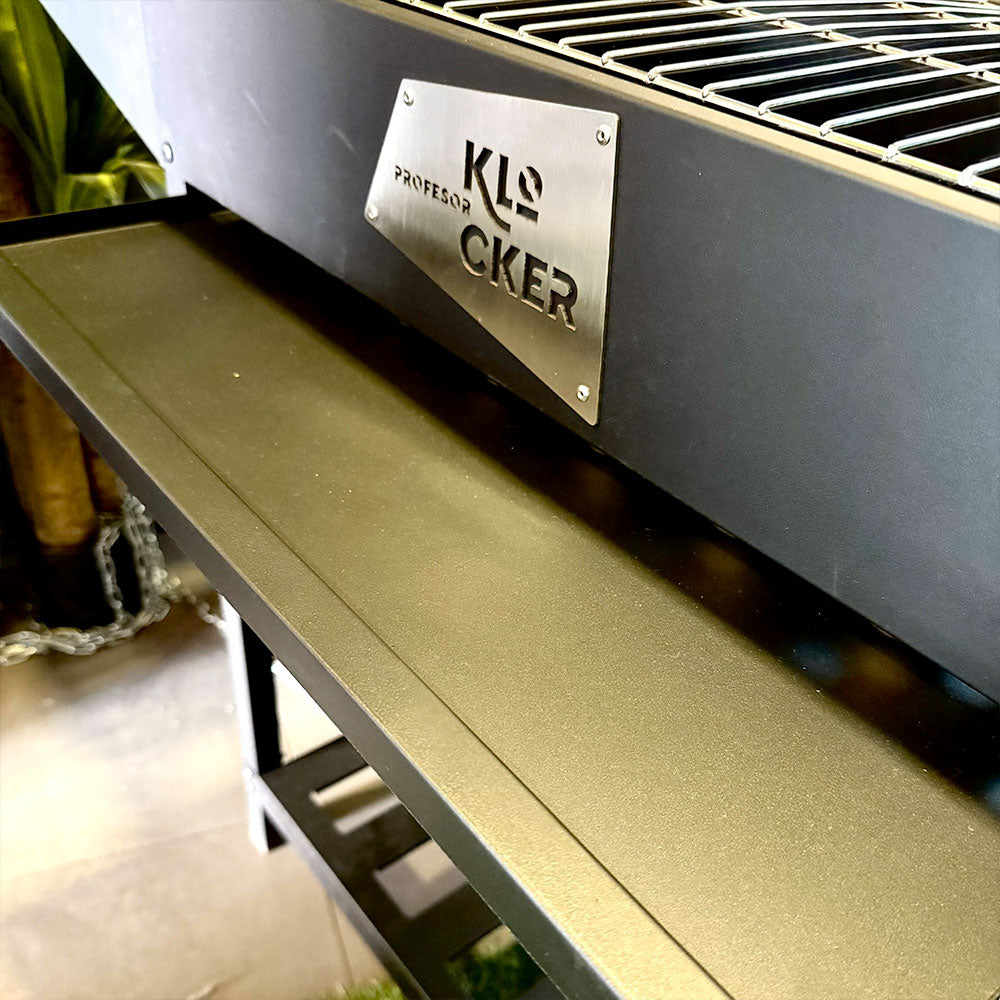 La Parrilla Volcano del Profesor Klocker combina lo mejor de la tradición parrillera con un diseño moderno y funcional. Su estructura rectangular de acero galvanizado con 1 mm de espesor le da robustez y estilo, mientras que su clásica rejilla móvil —que sube y baja— permite controlar la temperatura de cocción con precisión, ideal para dominar cualquier corte.