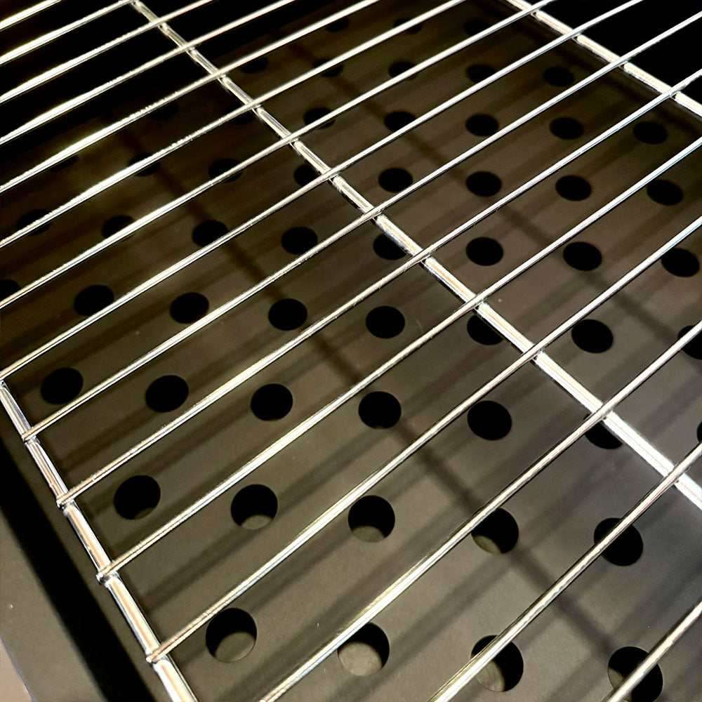 La superficie de asado de 40 x 60 cm en acero inoxidable ofrece amplio espacio para cocinar carnes en piezas completas o bifes, vegetales o embutidos con el máximo sabor. Sus bandejas laterales multiuso y el soporte inferior brindan practicidad, manteniendo todos los utensilios al alcance.
